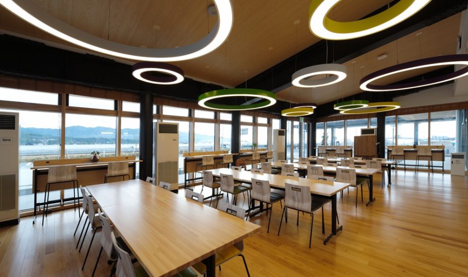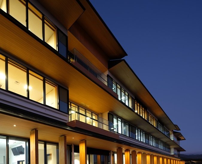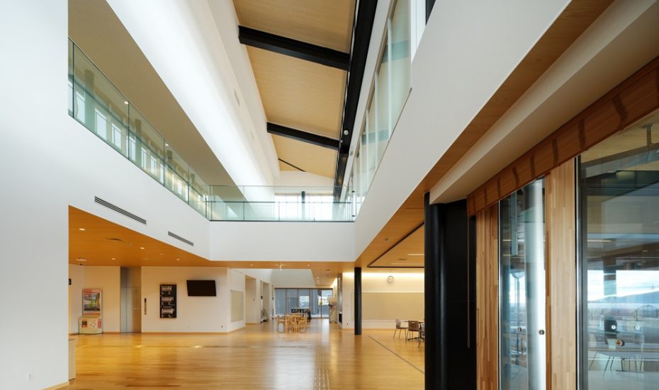 本建物は「市民の安全と安心を守り人と環境にやさしい庁舎」という基本理念の実現に向け計画しました。鉄骨造の市民協働スペース(エントランス、多目的室、食堂、会議室)は、東側の広場に面して雁行させて配置し、地場産のスギCLTの片流れ形状でかけ渡し、温かみのある空間をつくりました。また、南側にはCLTの縦ルーバーやテラスを設け、外観デザインのアクセントとしました。